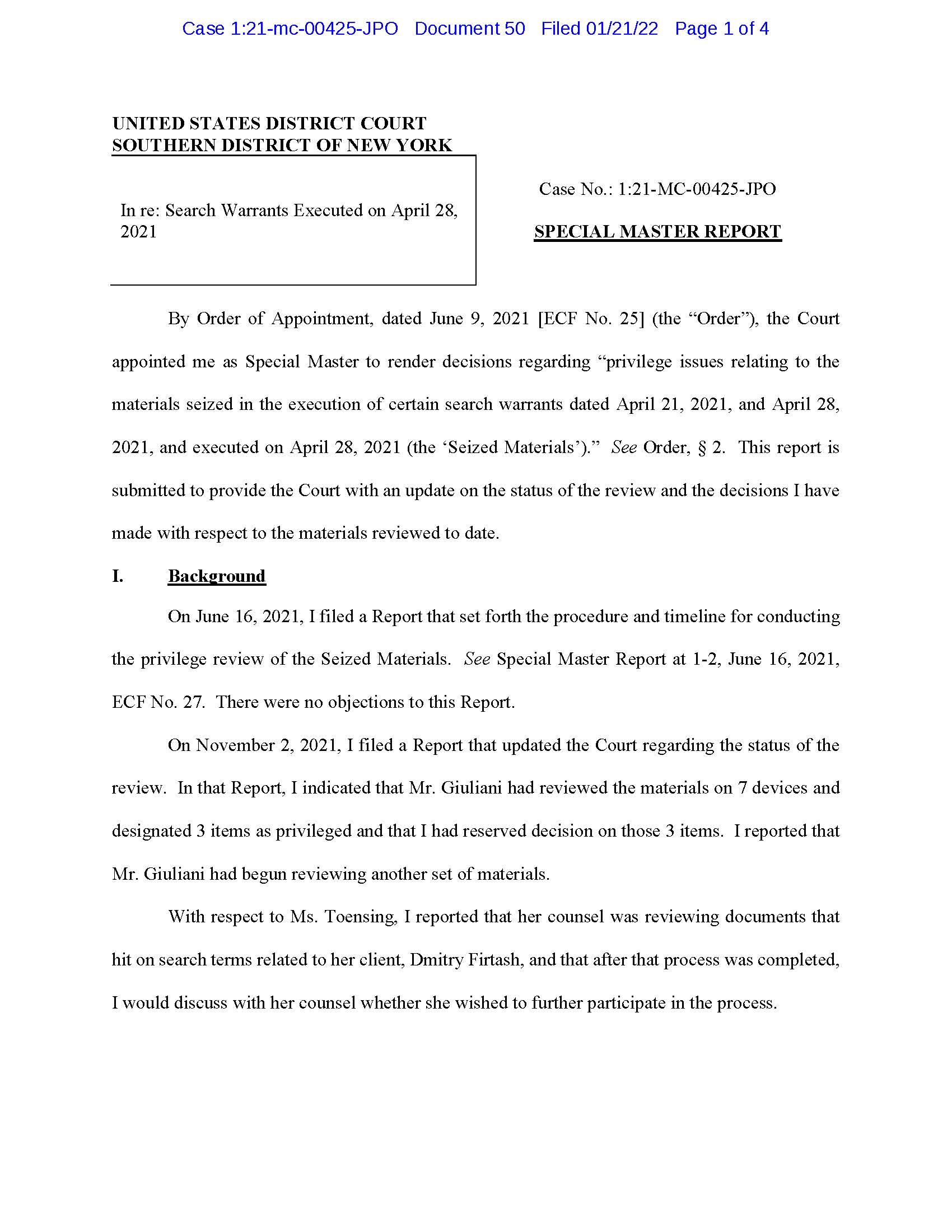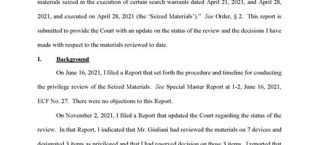 Link to Special Master’s Report filed in In Giuliani Toensing warrant case. January 21, 2022 ~ Tim Hogan ~ Leave a comment Pages from 20220122 (50) Special Master ReportDownload