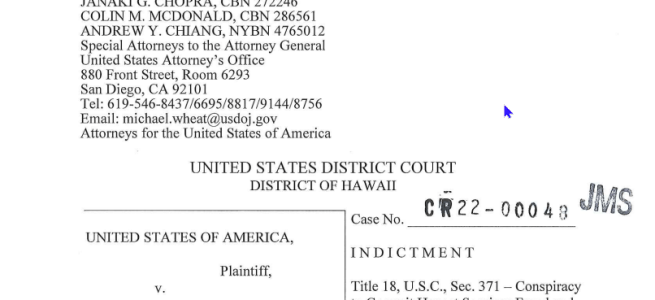 Former Honolulu Prosecutor Keith Kaneshiro indicted by Federal Grand jury on corruption charges. Link to indictment and docket.