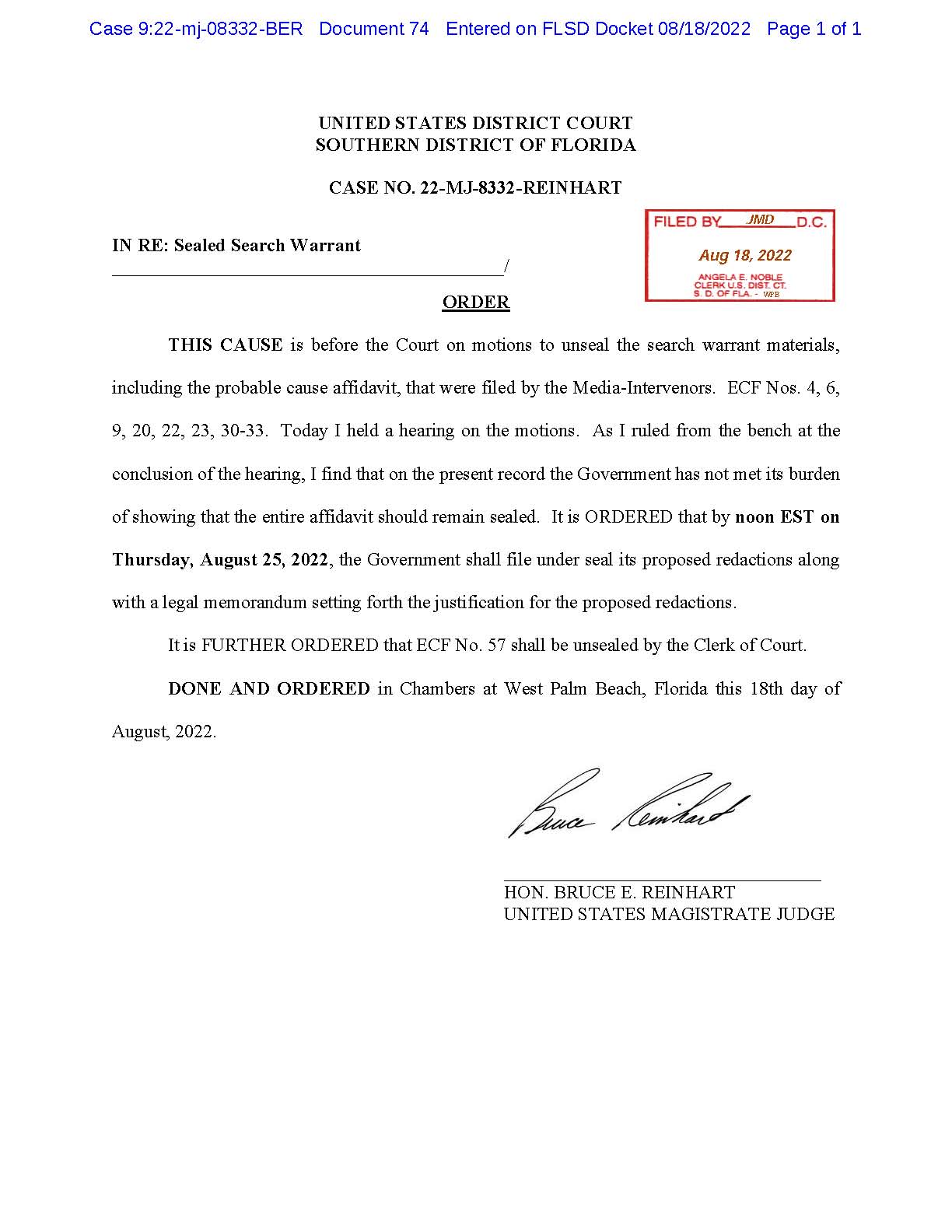 1. In the West Palm Warrant case, here are links to the Order on redactions and unsealing entered today plus the unsealed Docket no 57 ordered unsealed in the Order.